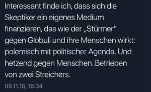 Nicht nur, dass hier die renommierte Zeitschrift „Der Skeptiker“ mit dem vulgärantisemitischen politpornografischen Hetzblattes „Der Stürmer“ verglichen wird (ein Vergleich, der zivilisierten Menschen nicht einmal in den Sinn käme), nein, das reicht dem Verfasser des Tweets nicht, er setzt auch die Redaktion eines renommierten und wissenschaftlich anerkannten Magazins mit Julius Streicher gleich, eben jenem Julius Streicher, der 1946 als Hauptkriegsverbrecher von den Alliierten zum Tode durch den Strang verurteilt wurde.