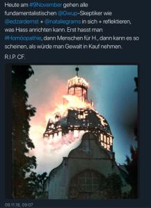 Am letzten Freitag war der 9. November und überall im Land wurde den Novemberpogrome von 1938 gedacht. Dieses Datum regte einen seit August 2018 aktiven, selbsternannten Verfechter der Homöopathie dazu an, diesen Tweet in die Welt zu schicken: