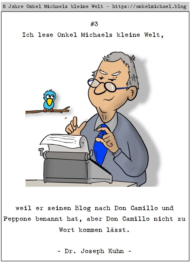 Ihr wisst ja, dass ich dieses Jahr meinen fünften Bloggeburtstag feiere. Um Euch die Wartezeit auf das Jubiläum zu verkürzen, habe ich ein paar liebe Freunde gefragt und die haben mir erzählt, warum sie Onkel Michaels kleine Welt lesen. Jeden Montag erscheint eines der Memes. Bisher erschienen die Memes von Cornelius Courts, Wolfgang Vahle, Joseph Kuhn, Ulrich Berger und Susanne Aust.