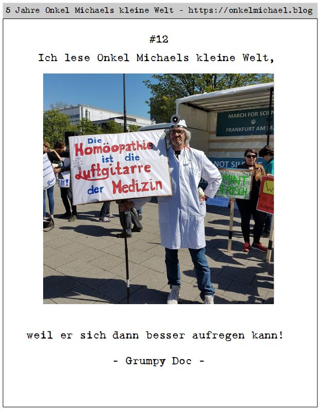 Heute haben wir nun die Teile 11 bis 15 der Montags-Memes. Heute haben wir Dr. Mirko Gutjahr, besser bekannt als „Der Buddler“, den Grumpy Doc, Oliver Rautenberg, alias „AnthroBlogger“, the faboulos Udo Endruscheit und die liebe Dr. Natalie Grams. Den Nummerierungsfehler habe ich erst nach der Veröffentlichung gesehen… /o\