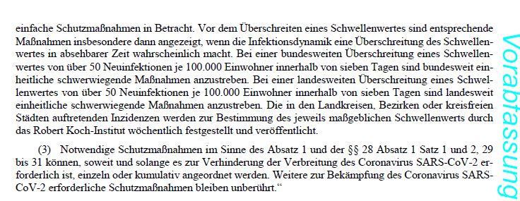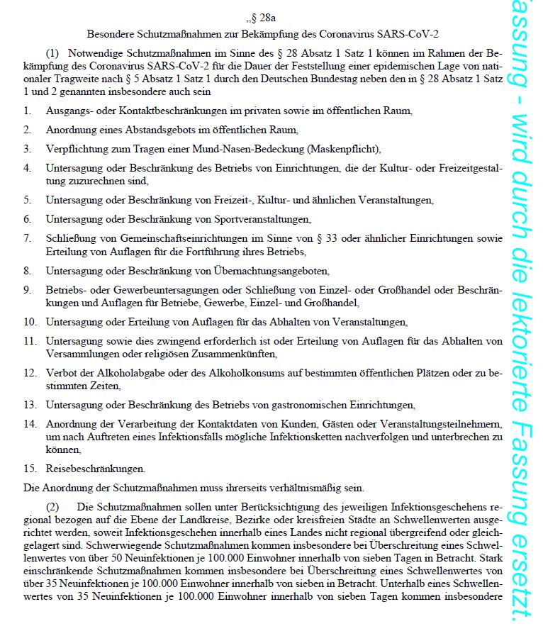 Im nun neu geschaffenen §28a, 1 sind die möglichen Schutzmaßnahmen nun einfach explizit aufgeführt und es gibt eine Verpflichtung dazu, dass die Maßnahmen verhältnismäßig sein müssen. Der zweite Absatz beinhaltet Vorgaben, wann die Schutzmaßnahmen getroffen werden dürfen, also die bekannte 35/50 je 100.000 Einwohner Regel. Und im dritten Absatz wird noch geregelt, dass die Schutzmaßnahmen einzeln oder kumulativ angeordnet werden können. That’s all. Das war’s.