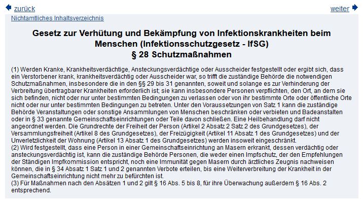 Und was da zu lesen stand, war etwas … nun sagen wir mal „unspektakulär“. Worum geht es? In §28 des Infektionsschutzgesetzes wird geregelt, dass im Falle einer epidemischen Lage von nationaler Tragweite Schutzmaßnahmen getroffen werden können, die temporär auch Grundrechte einschränken können. Hier der Wortlaut