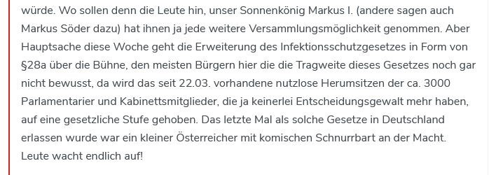 Die Tage wurde nun im Bundestag der Entwurf eines Dritten Gesetzes zum Schutz der Bevölkerung bei einer epidemischen Lage von nationaler Tragweite diskutiert und ihr könnt euch vorstellen, was nun wieder für ein hysterisches Geplärre herrscht. Die einzige Abwechslung ist, dass sich die Herrschaften nun nicht über den §56 erregen, sondern über den neu geschaffenen §28a. Der ist nämlich ganz, ganz schlimm. Ein neues Ermächtigungsgesetz! Schaut mal hier: