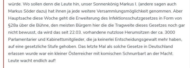Und das ist nun das pöhse, pöhse neue Ermächtigungsgesetz. Bisschen dünn dafür, oder? Aber es ist wie immer bei unseren Freunden von der Querfront: erst große Aufregung, hysterisches Geplärre und Panikmachen. Schaut man dann aber mal auf die Realität, auf die Wahrheit, dann bleibt nur eines: heiße Luft. Aber was will man von solchen Windbeuteln anderes erwarten?