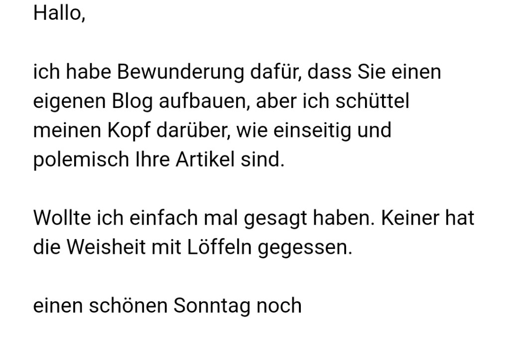 Zur Richtigstellung! Veröffentlicht am 8. Februar 202118. Mai 2021 von Onkel Michael Von meiner Leserin A.M. erhielt ich folgende Zuschrift: Zur Richtigstellung: natürlich habe ich die Weisheit mit Löffeln gegessen. Mache ich jeden Tag zum Frühstück. Hier ein Beweis: Ich hoffe, dass die Angelegenheit damit nun klargestellt ist. Teilen mit: Auf Facebook teilen (Wird in neuem Fenster geöffnet) Facebook Einen Link per E-Mail an einen Freund senden (Wird in neuem Fenster geöffnet) E-Mail Auf WhatsApp teilen (Wird in neuem Fenster geöffnet) WhatsApp Auf Bluesky teilen (Wird in neuem Fenster geöffnet) Bluesky Auf X teilen (Wird in neuem Fenster geöffnet) X Mehr Drucken (Wird in neuem Fenster geöffnet) Drucken Gefällt mir Wird geladen … Ähnliche Beiträge