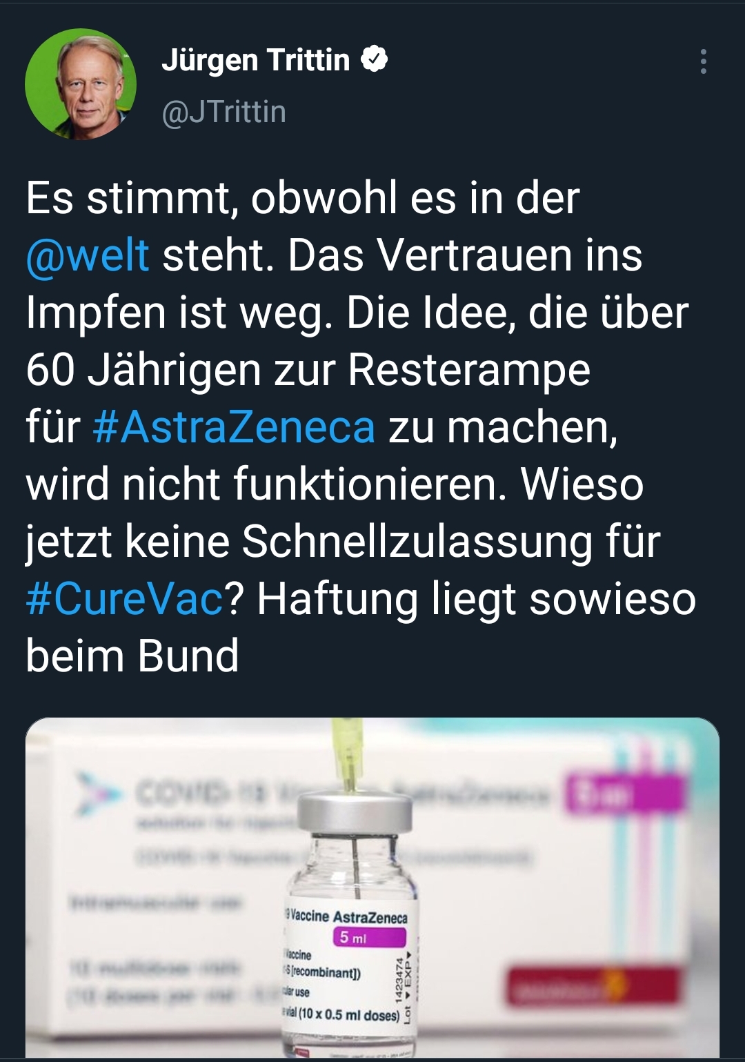 Lieber Herr Trittin, jetzt mal unter uns beiden Pastorentöchtern, was haben Sie sich denn bei diesem Tweet gedacht? Mussten Sie denn den Begriff „Resterampe“ für einen hoch wirksamen Impfstoff verwenden? Mussten Sie denn wirklich in derart populistischer Manier die Impfkampagne torpedieren? Mit diesem Tweet haben Sie den Eindruck erweckt, dass „die Alten“ mit einem minderwertigen Impfstoff abgespeist werden. Ja muss das denn sein? Wenn Sie nichts Produktives zur Diskussion beitragen können, dann sagen Sie doch einfach gar nichts, anstatt so einen populistischen Unsinn ins Volk zu blasen.