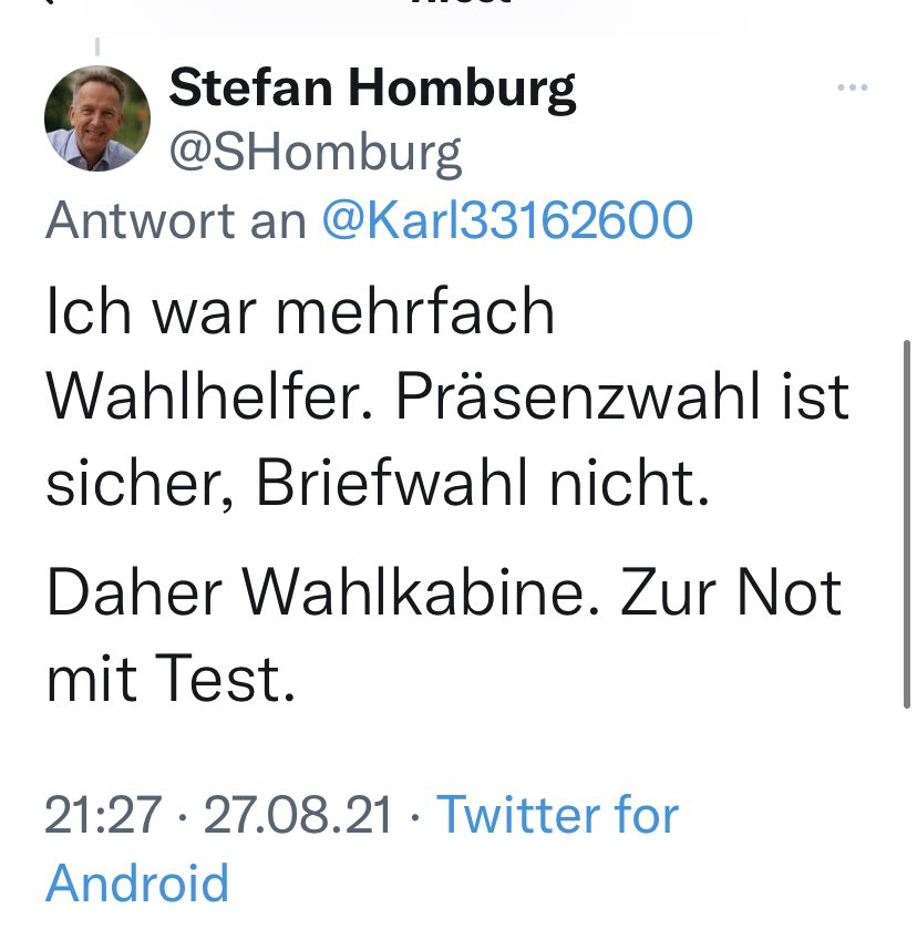 Obendrein möchte Herr Homburg offensichtlich, dass nur die Menschen wählen gehen, die die Wahllokale erreichen können. Ohne Briefwahl hätte ich (sitze im Rollstuhl) meine letzten Bürgerpflichten nicht wahrnehmen können. Und wie will er sehen, was ich in der Kabine in den Umschlag stecke? Könnte ebenso gut ein Briefchen Milzbrandbakterien sein …