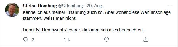 Das erinnert uns an etwas. Genau… da war was. Donald Trump und seine Anhänger haben das Narrativ der Briefwahlfälschung ebenfalls schon lange vor der Wahl angeheizt. Und auch der frühpensionierte Finanzwissenschaftler Stefan Homburg ist sich nicht zu schade, tausende von braven Angestellten und Beamten, die sich den Allerwertesten dafür aufreißen, dass die Wahl reibungslos und sicher abläuft zu diskreditieren.