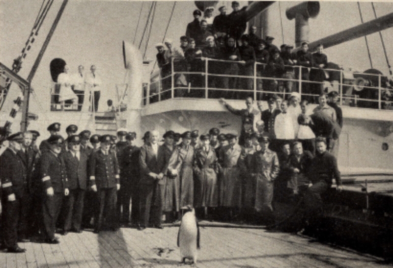 Alle Fahrtteilnehmer aber erfüllte mit besonderem Stolz ein Telegramm des Führers und Reichskanzlers folgenden Inhalts: ‚Den Teilnehmern an der Deutschen Antarktischen Expedition 1938/39 danke ich für die Meldung von ihrer Rückkehr in die Heimat. Ich verbinde damait meine herzlichen Glückwünsche zu der erfolgreichen Durchführung der der Expedition übertragenen Aufgabe. Adolf Hitler.‘
