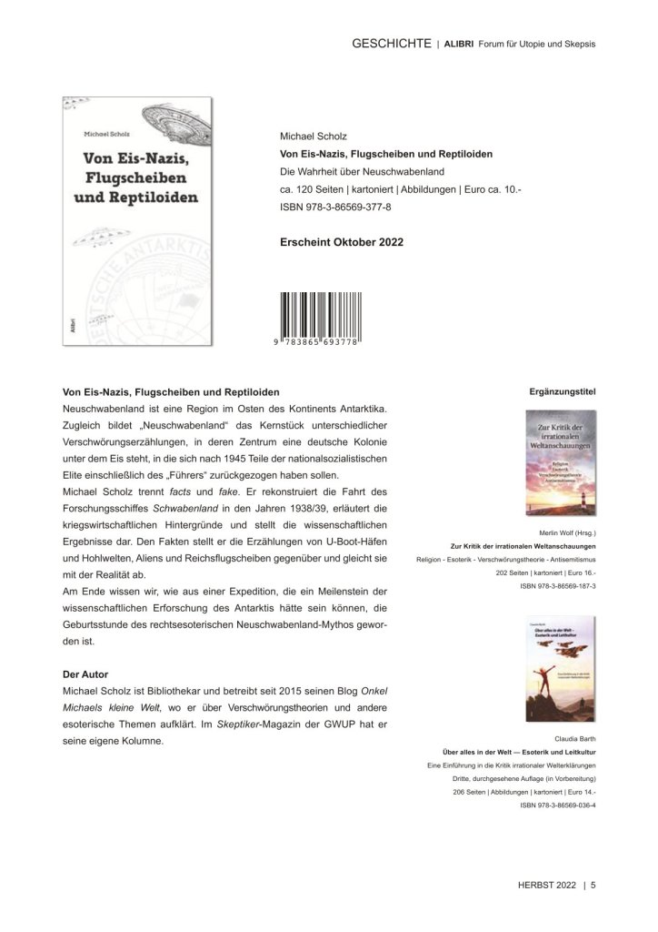 es gibt einfach Gelegenheiten, die muss man am Schopfe packen. Das habe ich getan und freue mich sehr, euch mitteilen zu können, dass im Oktober 2022 im Alibri-Verlag mein Buch „Von Eis-Nazis, Flugscheiben und Reptiloiden – Die Wahrheit über Neuschwabenland“ erscheinen wird.