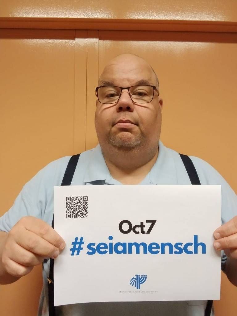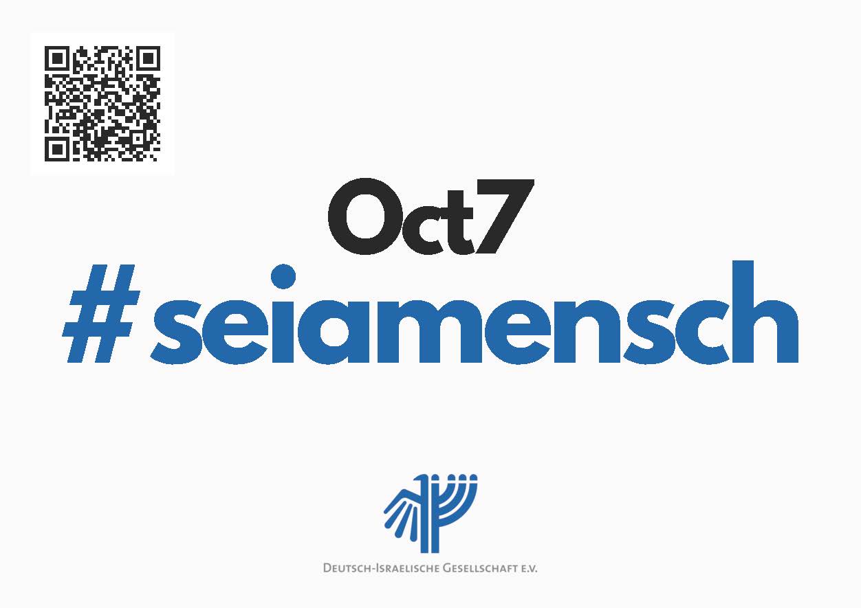 Die Deutsch-Israelische Gesellschaft ruft zur Teilnahme an der Solidaritätskampagne „seiamensch“ auf. Zeigen Sie am 7. Oktober 2024 Solidarität und Mitgefühl mit Israel und seiner Bevölkerung! Um die Kampagne zu unterstützen, bitten wir Sie, die beigefügte DIN-A4-Format auszudrucken und ein Foto von sich mit dem Plakat auf Ihren Social-Media-Kanälen inklusive des Hashtags #seiamensch zu veröffentlichen und die Deutsch-Israelische Gesellschaft e.V. zu verlinken (@digev_de).
