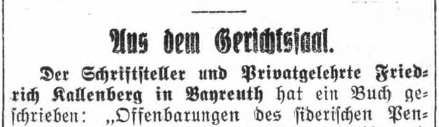Der Schriftsteller und Privatgelehrte Friedrich Kallenberg in Bayreuth hat ein Buch geschrieben: „Offenbarungen des siderischen Pendels, die Leben ausströmende Photographie und Handschrift“. Ein Justizrat in Charlottenburg, der das Buch gekauft hat, bezeichnete es in einem Briefe an den Verleger als Schwindel. Kallenberg stellte gegen den Justizrat Beleidigungsklage und behauptete in der Verhandlung vor dem Schöffengerichte, dass das siderische Pendel, das aus einem 35 bis 40 Zentimeter langen seidenen Faden mit einem daran geknüpften glatten Metallring besteht, im Kreise schwinge, wenn es über die Photographie eines Mannes, einen von einem Herrn geschriebenen Brief oder dergleichen gehalten wird, in einer von Nord nach Süd schwingenden Ellipse dagegen, wenn die Photographie etc. von einer Dame stammt; eine ostwärts führende Ellipse bedeute moralischen Zusammenbruch. Kallenberg will auch das Geschlecht eines Kindes vorausbestimmen können, was freilich erst dreimal gelungen ist. Der Kläger experimentierte im Gerichtssaal, um zu beweisen, daß sein Buch kein Schwindel sei. Der an einem Faden vom Zeigefinger herabhängende Ring bezeichnete richtig die vom Experimentierenden mitgebrachten Photographien männlicher Personen durch einen kreisförmigen, weiblicher Personen durch einen elliptischen Ausschlag. Ueber einer Kallenberg verdeckt vorgelegten Photographie wechselte der Kreis mit der Ellipse; Kallenberg meinte, es handle sich wahrscheinlich um einen Herrn mit femininem Einschlag. Der Prozeß endete mit einem Vergleich, in dem der Angeklagte zugab, daß er einige der vorgeführten Experimente für gelungen halte. Der Berichterstatter der „Berl. Morgenpost“ hat Verscuhe mit dem siderischen Pendel über einem leeren Blatt Papier angestellt; er veröffentlicht nun folgendes Resultat: Das Pendel beschrieb zuerst einen Kreis von rechts nach links, dann ging es in die „weibliche“ Nordsüdellipse über, beschrieb dann wieder einen Kreis, aber diesmal von links nach rechts, und schließlich eine Ostwest-Ellipse; zuletzt stand es still. Nach einer kleinen Pause begann derselbe Kreislauf von neuem. Diese Wirkungen sind offenbar eine Folge des Blutdrucks und entsprechen der periodischen Erneuerung des Blutdrucks in der Spitze des Fingers. Das Experiment mit dem „siderischen Pendel“ muß immer gelingen, wenn man es rechtzeitig unterbricht.