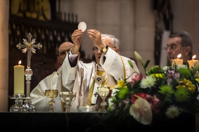 Der Priester hebt die Hostie der Gemeinde entgegen und spricht: Denn in der Nacht, da er verraten wurde, nahm er das Brot und sagte Dank, brach es, reichte es seinen Jüngern und sprach: Nehmet und esset alle davon: das ist mein Leib, der für euch hingegeben wird. Ebenso nahm er nach dem Mahl den Kelch, … Weiterlesen Das Ritual